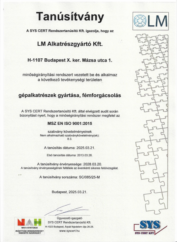 MSZ EN ISO 9001:2015 Minőségi tanúsítvány biztosítja a jelenlegi partnereink és a leendő partnereink számára, hogy az irányítási rendszer követelményeinek megfelelően történnek a munkafolyamatok.